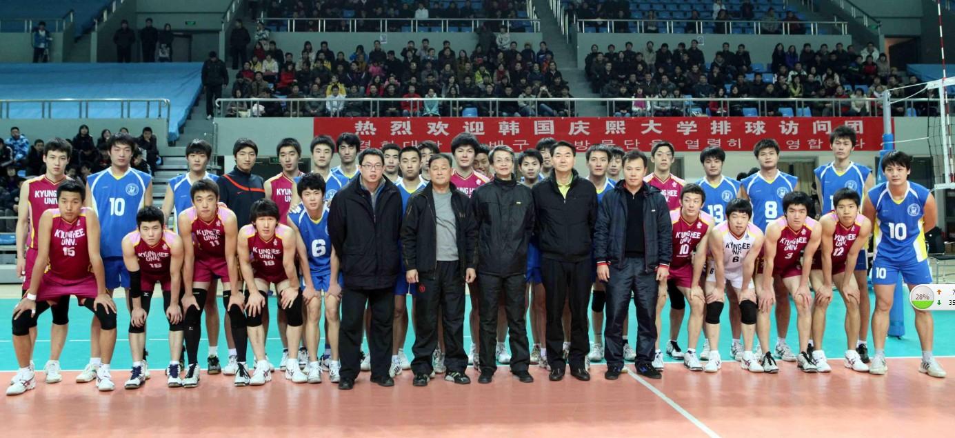 1月11日,韩国庆熙大学排球队一行18人,到达我校青岛校区进行为期10天的集训交流活动。14日晚,在青岛校区体育馆进行了我校男排与庆熙大学男排的友谊赛,在全场近一千名观众的呐喊加油声中比赛高潮迭起、精彩纷呈、争夺激烈。前四局打成二比二平,第五局打到白热化,庆熙大学不愧为一支劲旅,凭借强有力的进攻而取得胜利,五局的比分是:25:20,22:25,25:20,22:25,18:16。我男排虽以两分之差没有赢得比赛,但是我们看到了他们在技、战术和作风上有了明显的提高和进步,希望他们继续努力,加强训练及磨合,争取在今年的全国大学生超级联赛中取得好成绩。