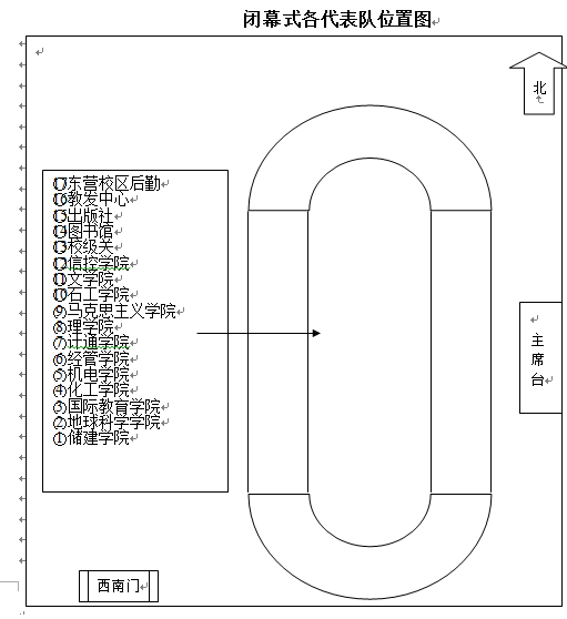 全部项目结束后,闭幕式开始前,组委会进行成绩统计,期间安排歌曲演唱过渡,各单位方队直接从田径场西侧跑道整理队伍,在闭幕式(主持人宣布教练员、运动员入场时)由引导员、旗手引导,成两列纵队进入田径场指定位置,各单位方队预备位置及入场路线如下图所示: