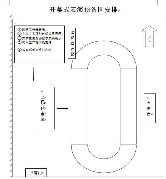 1)开幕式入场方队进场后,大会进行各项讲话议程时,没有入场任务的表演队员要求在演员集合区集合,有入场任务的队员在运动员退场时要迅速赶到演员集合区集合;
