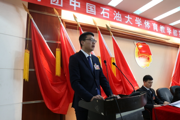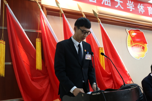 校团委副书记石国卿从坚持立德树人根本任务,不断强化思想引领;依托突出体育特色,打造体育活动品牌;竞技体育站在高原、勇攀高峰等方面肯定了9728太阳集团共青团的工作,寄语全体团员要坚定理想信念、练就过硬本领、全面发展自己。