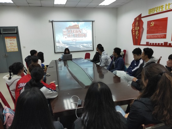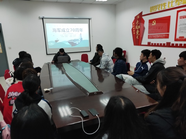 为学习领会习近平强军思想,庆祝中国人民解放军海军成立70周年,4月28日,高水平运动队2018级团支部在体育馆会议室开展“献礼海军节·共筑中国梦”主题团日活动。