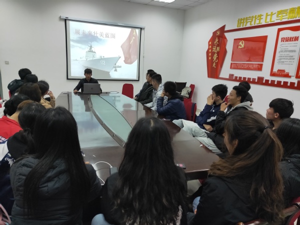 “忆往昔峥嵘岁月”,团支部副书记姜相屹首先通过PPT讲解,带领大家了解并学习海军发展的艰辛历史以及海军成立70周年以来所取得的伟大成就,观看自清朝末期以来各国舰船吨位变化等视频,让大家直观地感受中国海军发展到今的不易,激起同学们心中对海军的敬仰与爱戴之情。“看今朝激荡岁月”,今天中国海军的强大离不开那些英勇的海军将士们的付出。同学们通过小组分工深入挖掘感人至深的海军故事,通过PPT以及情景模拟等进行展示。同学们还对海军发展历程、海军知识常识、舰艇知识等方面进行了分享介绍,让大家对海军有了更加全面的了解。“展未来壮美蓝图”,团支部副书记姜相屹带领大家一起观看庆祝海军成立70周年阅兵活动视频。同学们对处在强大的中国人民解放军海军的保护下而感到骄傲和自豪,同时对首次公开亮相的舰艇展现出极大的兴趣,张明儒说:“新的舰艇必将拥有更加强大的火力,中国人民海军的发展将会更上一个台阶。”