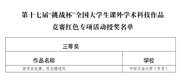 日前,第十七届“挑战杯”全国大学生课外学术科技作品竞赛(红色专项)评审结果公布,我部砥砺前行实践队提交的作品《讲周家故事,传总理遗风》获全国三等奖。