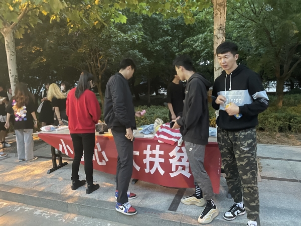 当晚六点三十分,班长武涛带领同学们挂横幅、摆桌椅,并把同学们自己准备的旧物罗列好。七点活动准时开始,同学们积极宣传、引导“顾客”,围观购买的人越来越多。从最开始本院的师哥师姐,到后来不少学校老师也前来光顾。通过一个小时的义卖,团支部共积攒了107元的爱心基金。