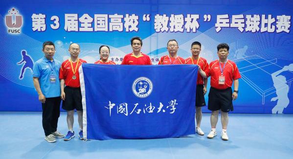 6月26-27日,第三届全国高校“教授杯”乒乓球比赛在山东潍坊举行,我校地球科学与技术学院杨少春教授、董春梅教授、陈勇教授,新能源学院吴明铂教授,理学院闫向宏教授、曾景斌教授参加比赛并取得好成绩,其中曾景斌教授获得40岁以下组男子单打第三名,陈勇教授与华北理工大学王震教授组队获得40-49岁组男子双打第三名。
