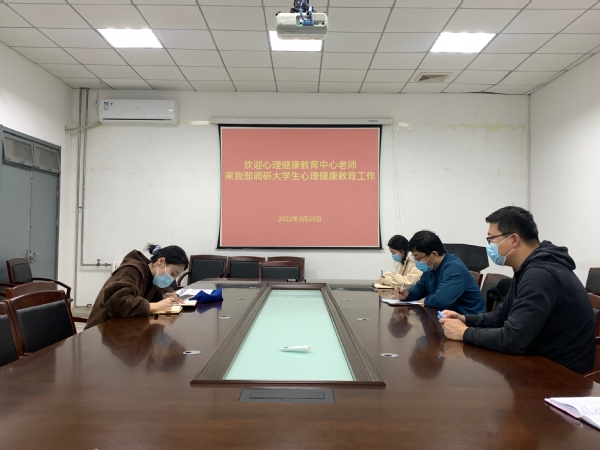 2022年3月25日,学校党委学生工作部心理健康教育中心王人立老师到我部调研指导大学生心理健康教育工作,部党委副书记卢志同、部团委书记姜庆林与辅导员参加此次调研。