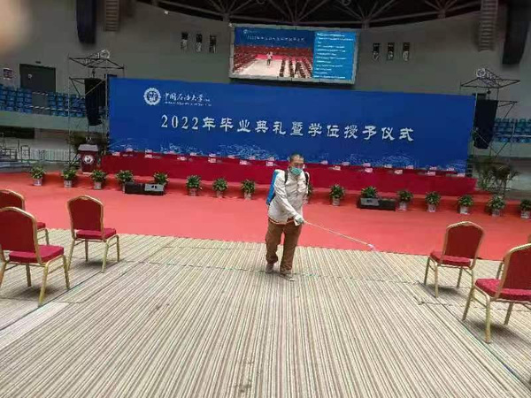 为保证毕业典礼期间疫情防控工作落实到位,体育场馆管理中心在洗手间、会场入口等位置放置了洗手液、消毒液等防疫物品,严格检测入场人员体温,并对主会场、走廊等重点区域进行了全方位的消毒,从严从实做好疫情防控工作,圆满完成了2022年毕业典礼暨学位授予仪式的场地保障任务。