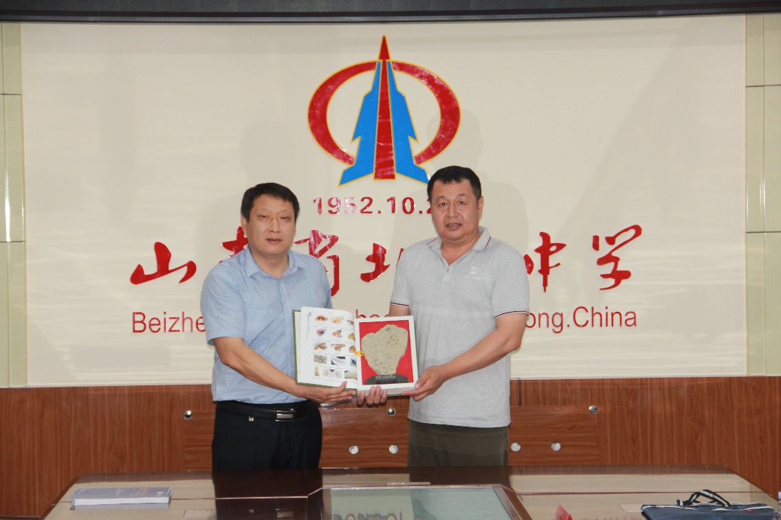 随后,姜永增为北镇中学授优质生源基地牌,双方共同签订了优质生源基地建设协议。张丙华代表我校向北镇中学赠送化石标本。