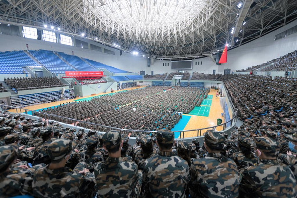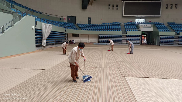 军训期间,体育场馆管理中心支持配合举行了军训动员大会、军训合唱比赛、以21级学生为教育对象的各类相关讲座,包括保卫处组织的“预防诈骗”安全讲座、校医院开展的心肺复苏急救知识讲座、消防安全演练等,从活动前期的保洁、场地布置、灯光音响再到活动后的现场清理、消杀和恢复,在高频次活动承办的压力下,场馆全体工作人员全力以赴、细心把控,如期交出了一张张漂亮的答卷。