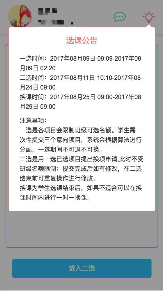 3.二选开始后,学生可进入二选,点击课程进行选课(二选会增加可选名额并取消班级名额限制)。