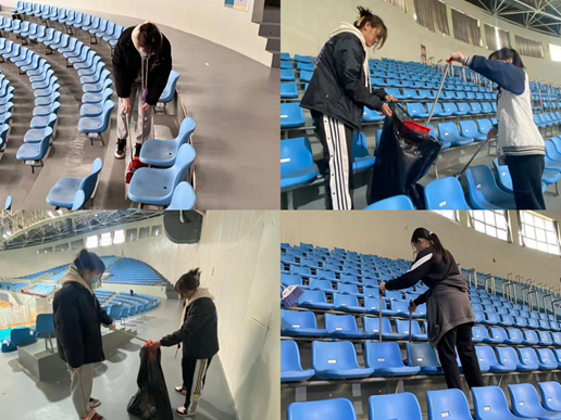 志愿者首先根据自己的工作分配,到达指定地点,以认真细致的态度对体育场馆进行清理。在一楼的排球场地,志愿者仔细地捡取了遗落在座椅后方以及地面上的垃圾;在二楼的志愿者不辞辛苦地用笤帚和簸箕将看台大大小小的垃圾收入袋中。