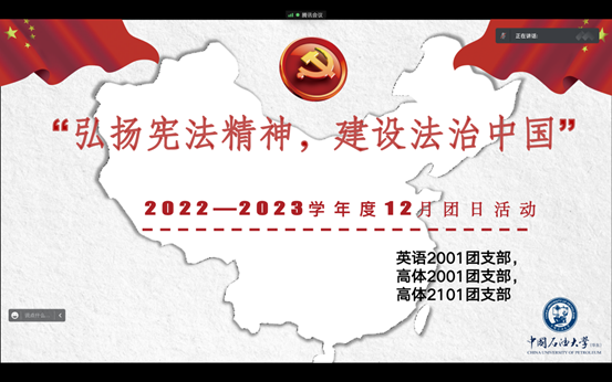 近日,英语2001团支部、高体2001团支部以及高体2101团支部联合开展以“弘扬宪法精神,建设法治中国”为主题的团日活动。本次活动以线上会议的形式开展,邀请文法学院“闻法”宣讲团成员法学22级研究生孙丽颖学姐为大家系统地介绍普及宪法知识。