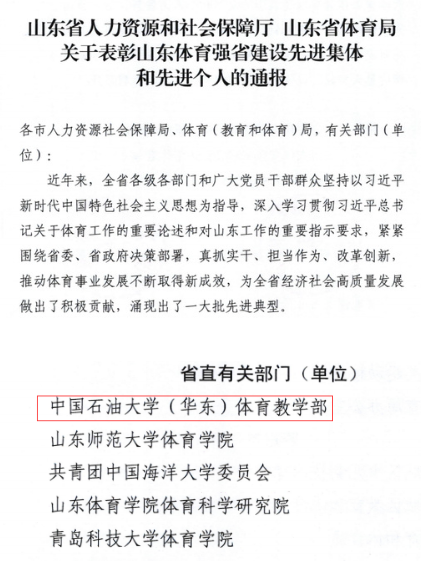 2022年8月,山东省人力资源和社会保障厅、山东省体育局联合下发《关于表彰山东体育强省建设先进集体和先进个人的通报》,我校9728太阳集团被评选为“山东体育强省建设先进集体”。