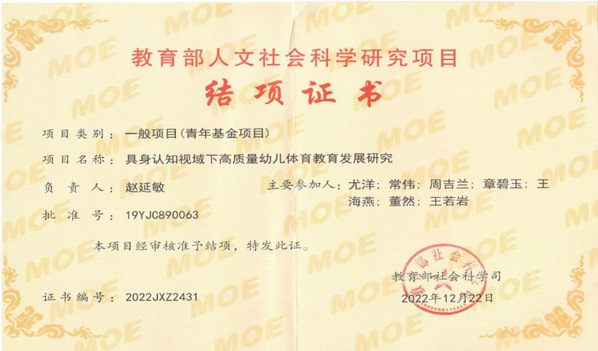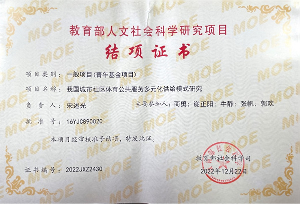 近日,教育部社科司公布了2022年度教育部人文社会科学研究一般项目(青年基金项目)结项名单,我部宋述光主持的《我国城市社区体育公共服务多元化供给模式研究》和赵延敏主持的《具身认知视域下高质量幼儿体育教育发展研究》均圆满完成研究任务,顺利结题。
