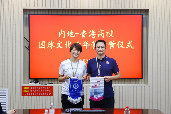 香港城市大学黄彩琪与青年营项目负责人翁炀晖互赠校旗
