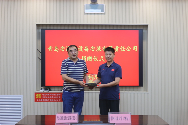 青岛安泽源设备安装有限责任公司向学校捐赠10万元,设立“石大男子排球发展基金”,支持学校男子排球队比赛、训练等活动。周伟代表学校接受捐赠,并向马林颁发捐赠证书。姜永增向马林赠送70周年校庆纪念品。