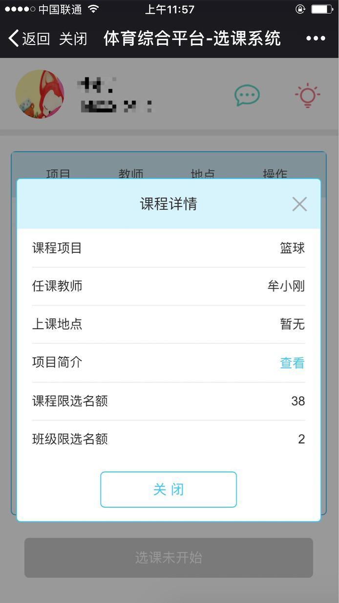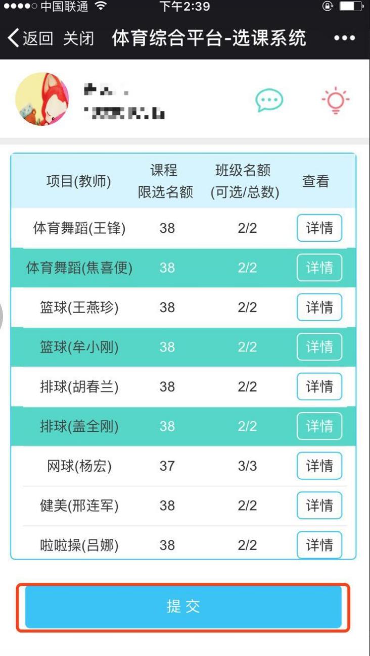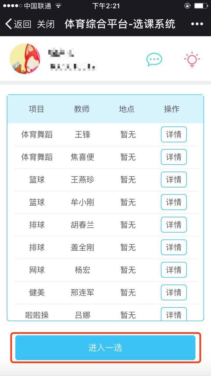 1.选课未开始前,进入选课页面,可提前浏览可选课程项目,教师,地点(田径场),点击详情可查看限选名额。