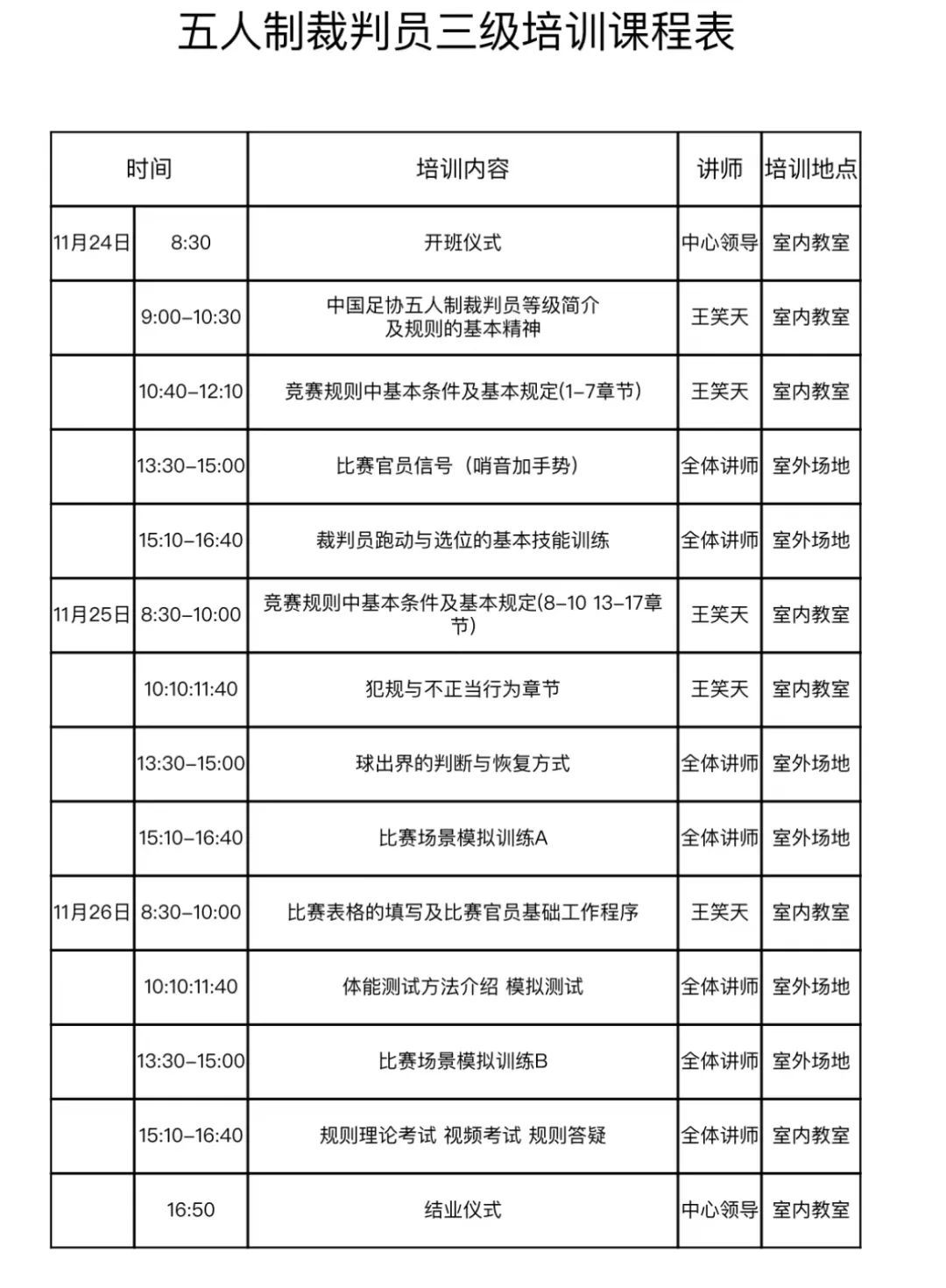 本届裁判培训班邀请到了中国足协五人制超级联赛裁判,国家级裁判王笑天和蘧广顺主讲。培训班严格执行《中国足球协会三级裁判员培训大纲》的要求,采取理论与实践相结合的教学方式,向学员们传授最新的足球竞赛规则。