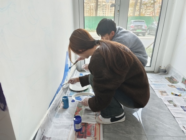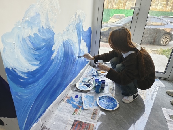 活动的第二部分为对墙面初稿进行涂改上色,同学们分组对墙面进行绘制。墙面手绘需要扎实的美术功底和耐心,在绘制期间,面对巨大的工程量,同学们相互帮助、互相协作。虽然绘制过程中遇到了各种问题,但经过共同协商与修改,同学们保证了墙画的观赏性和艺术性,充分展现出石大学子扎实的专业素养和青春风采。