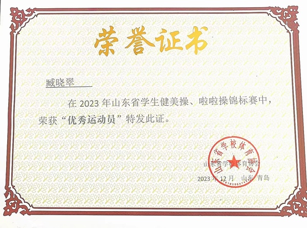 臧晓翠同学获评“优秀运动员”称号
