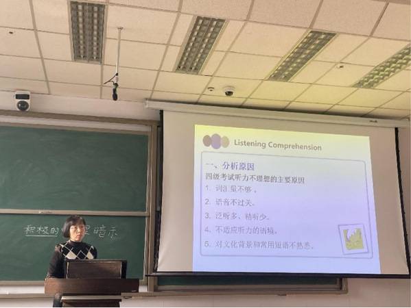 分享会上,熊小秦老师首先指出,学英语首先要背好单词,掌握朗读技巧由易到难,循序渐进,并从写作、听力、阅读和翻译四类题型入手,重点介绍英语四六级考试的题型特点、解题思路和常见失分点,同时结合大量案例进行了详细分析和讲解,使同学们更加深入地理解了考试的要求和技巧。随后,熊小秦老师分享了“听读结合”、“碎片化时间”、“分板块逐个突破”等学习方法,强调词汇积累、阅读技巧和写作表达等方面的重要性,鼓励同学们通过多角度、多方式的学习来提高英语水平,更自信地应对考试。