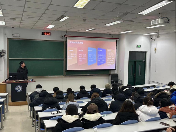 本次活动邀请文法学院法律宣讲团为同学们进行宪法主题宣讲。首先,宣讲人徐吉扬带领大家初识宪法,他讲解了宪法的发展历程、国家宪法日和宪法的地位。随后,同学们翻阅宪法书籍,学习宪法内容和各项法律条例,并观看了CCTV年度法制人物特别节目,了解宪法与法制,感受法律的重要性。最后,在“宪法接龙”、“你说我猜”等趣味游戏中,同学们身临其境,利用默契的配合和丰富的法律知识,代入式、沉浸式感受到了宪法的重要性和普遍性。