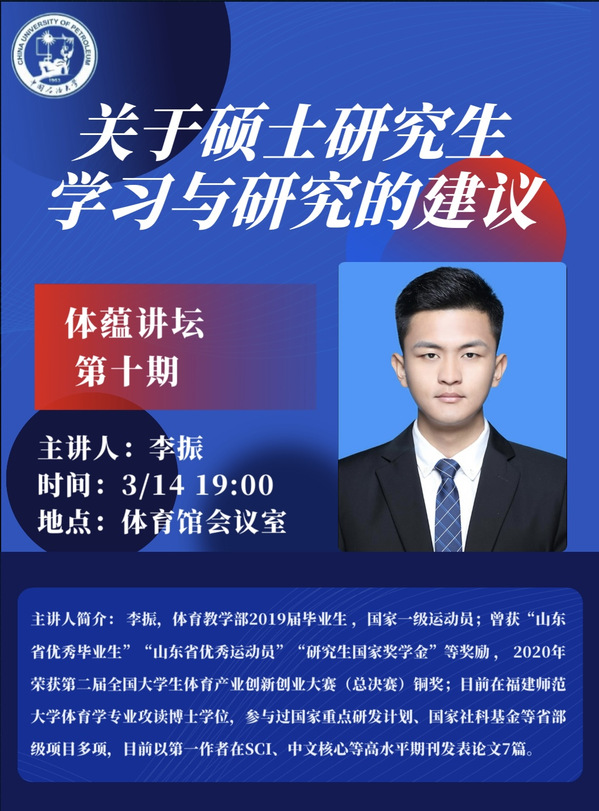 本次讲座旨在发挥优秀榜样的引领作用,为体育学研究生的科研学习提出可行建议,明确奋斗目标和方向,为研究生提升科研能力打下坚实基础。