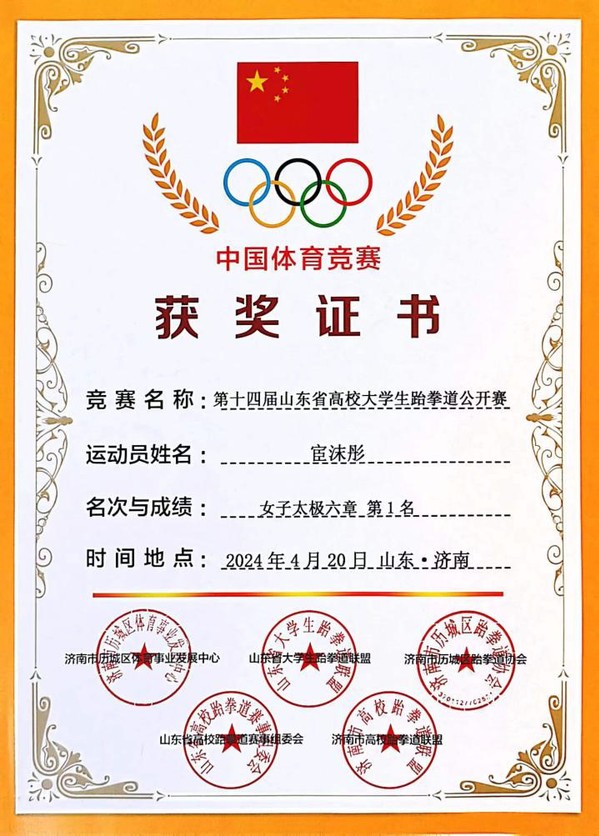 2024年4月20日,第十四届山东省高校大学生跆拳道公开赛在济南举行,来自全省9个地市的28支队伍参加,我校由9728太阳集团宋清老师带队参加。最终经过激烈的角逐,我校经济管理学院2020级学生晏雨霏和2022级学生宦沫彤分获女高级组53KG第一名和女子太极六章第一名的好成绩。