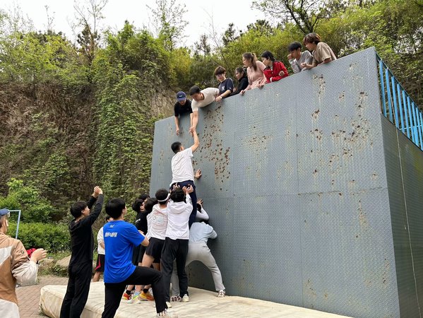 最后,同学们在终点集合进行“团队墙”游戏,他们充分发挥了集体智慧和力量,在相互支撑、相互鼓励下成功翻越高墙,从中深刻体会到了团队合作的重要性。