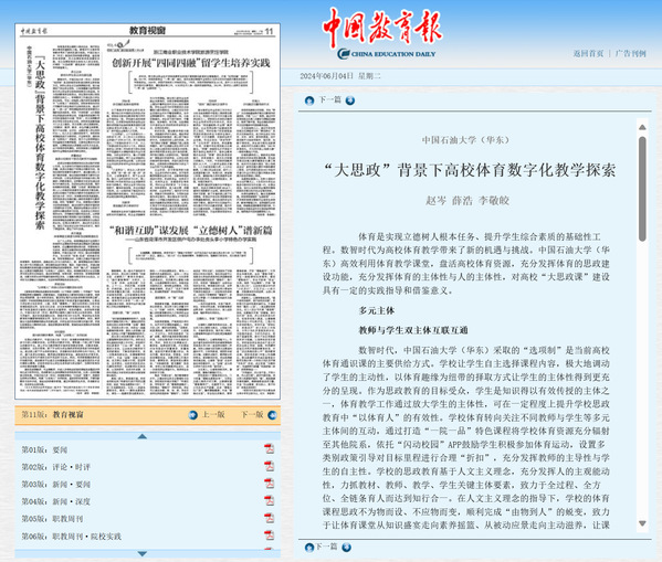 体育是实现立德树人根本任务、提升学生综合素质的基础性工程,数智时代为高校体育教学带来了新的机遇与挑战。近年来,学校充分利用体育教学课堂,创新数字化教学方式方法,有效整合体育资源,充分发挥体育的思政建设功能,有效促进了学校“大思政课”建设,促进了学生的全面发展。6月4日,中国教育报以“太阳成集团tyc9728:“大思政”背景下高校体育数字化教学探索 ”为题聚焦报道我校体育课程思政建设的典型做法。