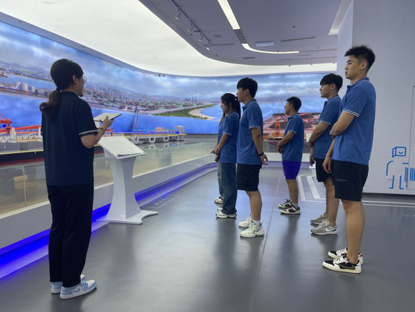 在日照港科技馆,通过讲解员的讲解、视频展示,实践队队员对日照港顺岸全封闭自动化集装箱码头、日照港大宗干散货智慧绿色示范码头、海龙湾生态保护及生态码头建设情况进行学习,总结日照港在智慧绿色港口建设方面取得的成就,感悟日照港面对全国港口百舸争流、千帆竞渡的发展态势,发扬“自我加压、勇争一流、真抓实干、开拓进取”精神,推动港口发展实现新突破的感人故事,进一步感受新质生产力给日照港带来的翻天覆地的变化。