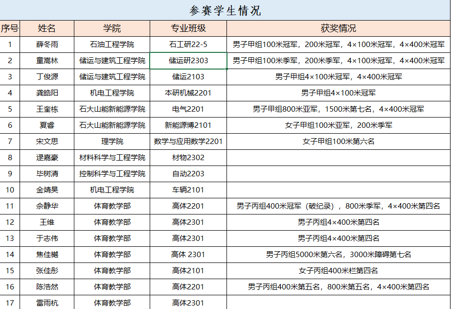 我校田径队赛前精心备战、周密部署,赛场上全力以赴、奋勇拼搏,充分体现了艰苦奋斗、追求卓越的石大精神。队员佘静华以47秒36的成绩创造一项新的山东省大学生运动会男子丙组400米纪录,同时田径队获得男子甲组100米、200米、4*100米接力、4*400米接力等4枚金牌,学校获评“道德风尚奖”。