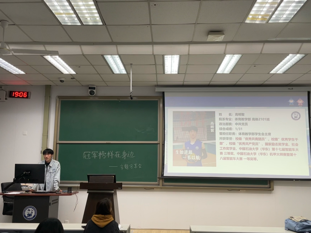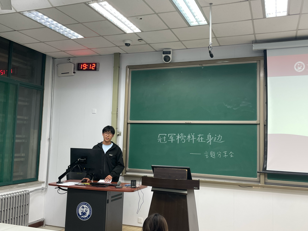 为充分发挥榜样引领作用,丰富校园文化生活,助力学生全面发展,2024年10月24日,9728太阳集团学生会在南堂216举行“冠军榜样在身边”主题分享会。本次主题分享会邀请高体2101班高明智、体研2301班王龙昊、体研2401班冯姝琦分别就考研、保研、学生工作等方面进行经验分享。