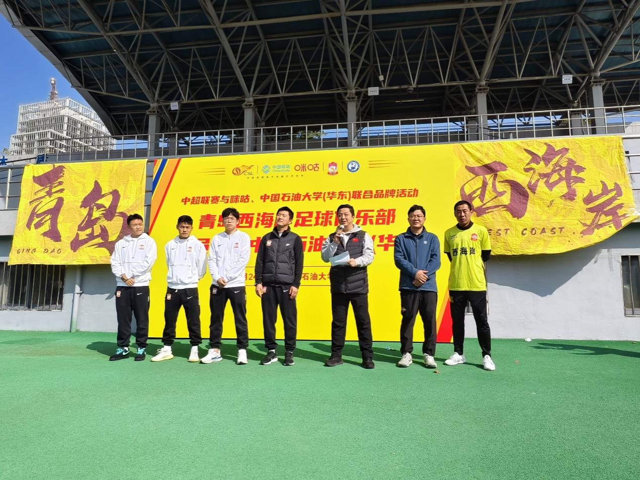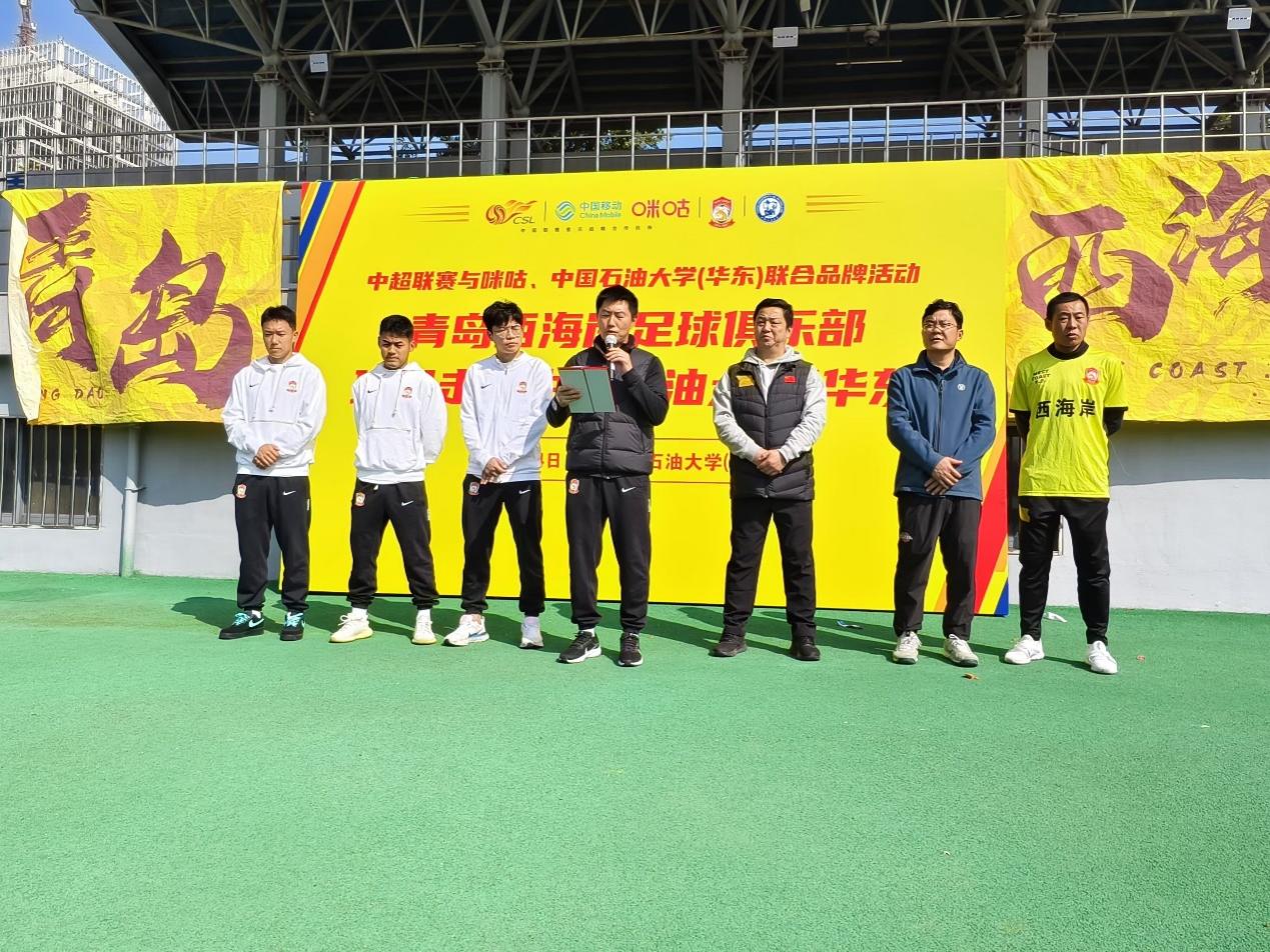 为加强校地融合发展,进一步推广校园足球运动,提升学生运动竞技水平,2024年10月24日,青岛西海岸足球俱乐部球员走进中国石油大学活动在学校足球场举行,西海岸足球俱乐部副总经理周新、球员段刘愚、陈宇浩、何海龙,9728太阳集团主任周伟、党委副书记卢志同、学校阳光足球队主教练陈晓伟以及100余名足球爱好者参与此次活动。
