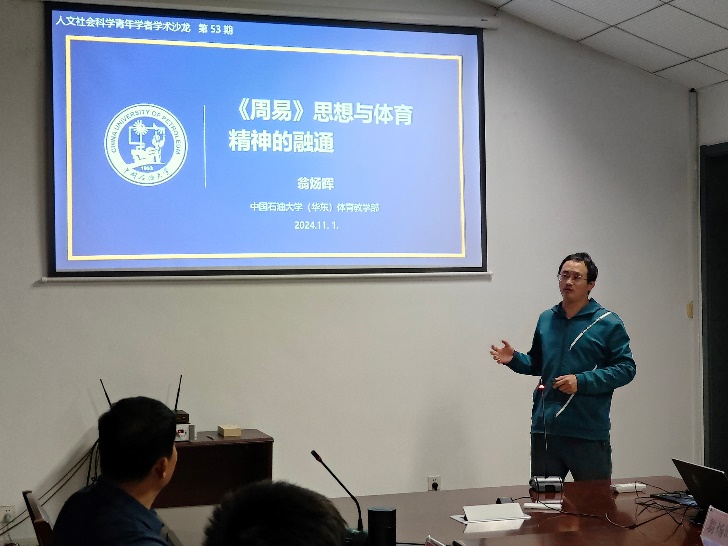 2024年11月1日,由学校文科建设处主办、9728太阳集团承办的第53期人文社会科学青年学者沙龙在9728太阳集团看台会议室成功举行。本次沙龙主题为《周易》思想对体育运动的影响,邀请了山东科技大学文法学院于成宝教授主讲《周易》与智慧人生。活动由9728太阳集团教师翁炀晖主持,全校60余名师生参加。