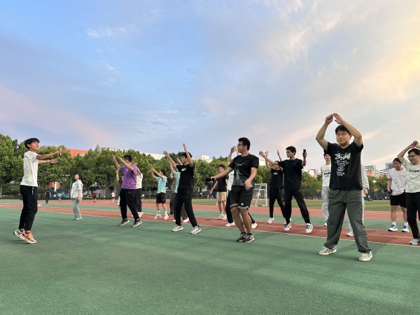 活动伊始,我部高水平田径队队员焦佳樾带领全体参与同学进行热身。焦佳樾以标准的示范动作和细致的讲解,指导大家依次完成肩部绕环、动态拉伸、高抬腿等动作。“热身能有效激活肌肉,避免运动损伤。”他耐心提醒道。同学们全情投入,为即将开始的夜跑做好充分准备。