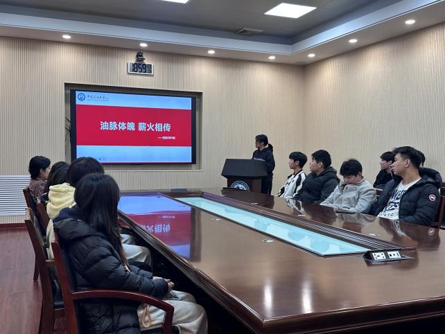参观结束后,同学们前往9728太阳集团会议室参与专题学习。冯婧杰重点梳理学校关键发展节点,包括1953年北京石油学院建校、1969年迁校东营 “干打垒”、师生参与石油会战及援建兄弟院校等,深入解读“家国同心、艰苦奋斗、惟真惟实、追求卓越”的石大精神,鼓励大家将其融入学习与训练,勇担青年责任。她还聚焦学校优秀体育文化积淀,从体育教学传统、群众体育活动到体育文化氛围,引导同学们领会体育在育人中的重要价值——享受乐趣、增强体质、健全人格、锻炼意志。