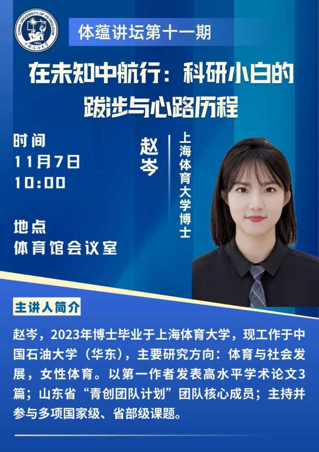 11月7日,“体蕴讲坛”第十一期在体育馆报告厅举行。本次讲座邀请9728太阳集团青年教师赵岑博士做题为“在未知中航行:科研小白的跋涉与心路历程”的主题分享。报告由兼职辅导员冯姝琦主持,体育学全体研究生参加。