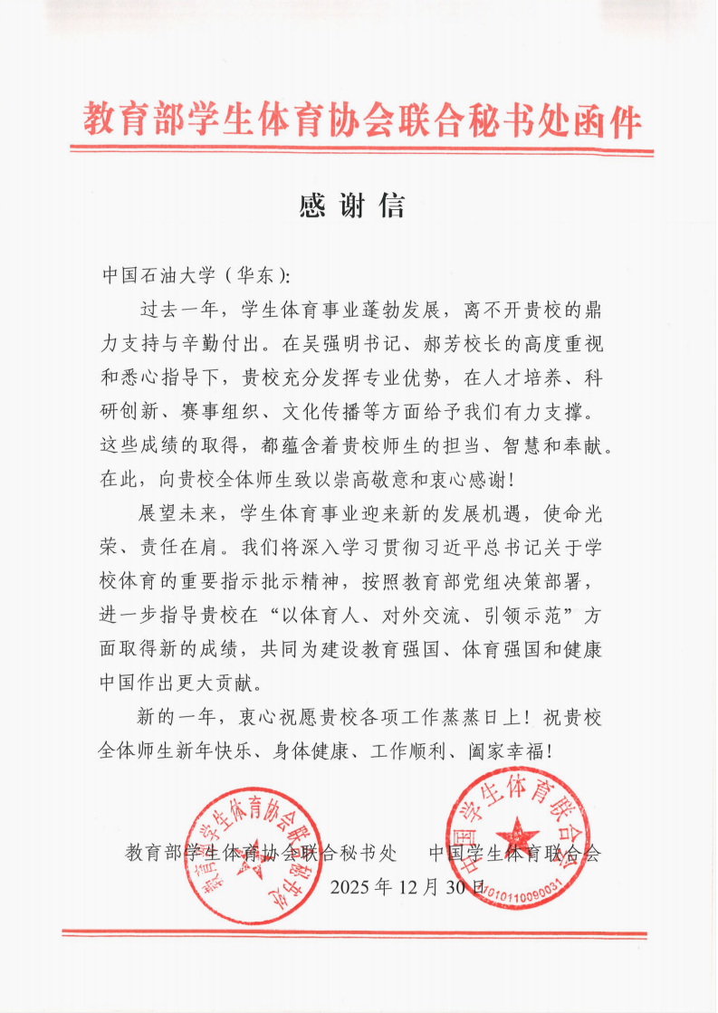 近日,教育部学生体育协会联合秘书处、中国学生体育联合会向我校发来感谢信,对我校过去一年在学生体育工作中的突出贡献给予高度评价。