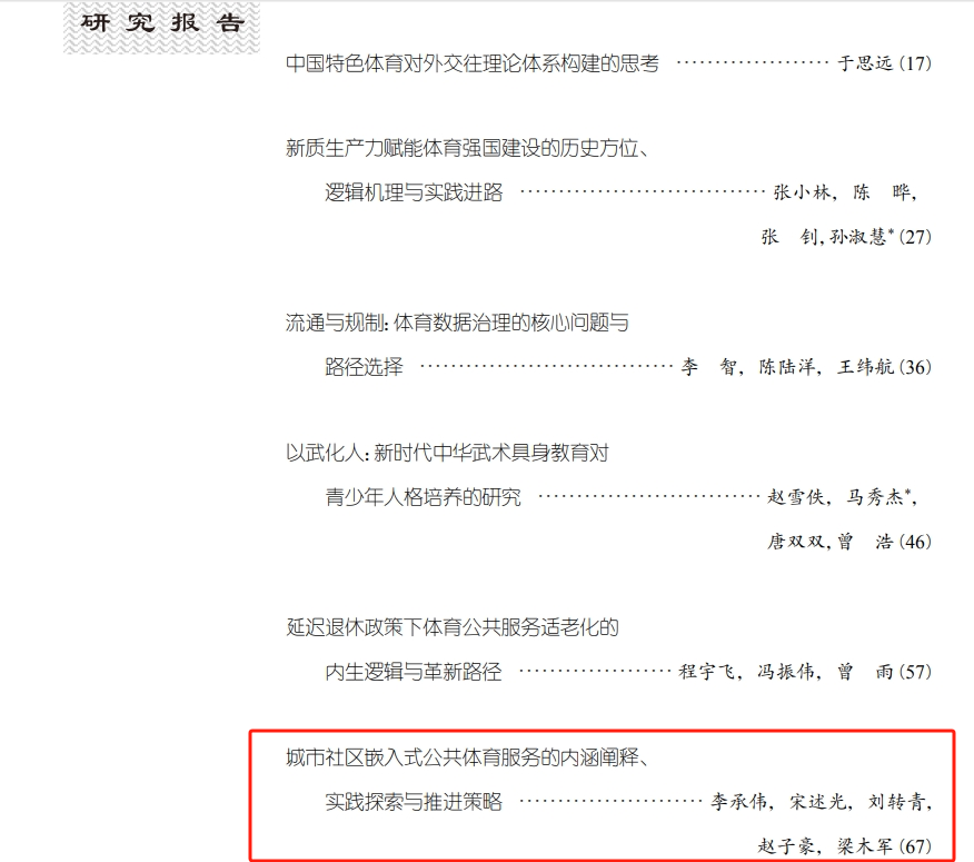 2025年共发表论文15篇,其中CSSCI论文2篇,北大核心期刊1篇,SCI论文6篇。李承伟团队在体育学领域权威期刊《体育科学》2025年第2期发表题为《城市社区嵌入式公共体育服务的内涵阐释、实践探索与推进策略》的研究成果。《体育科学》是由国家体育总局主管,中国体育科学学会主办的国内体育学科领域的顶级期刊。